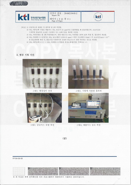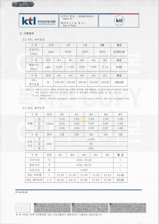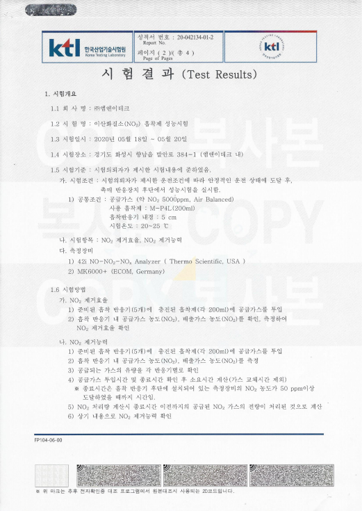 강력한NO2흡착제/KTL 시험 성적서